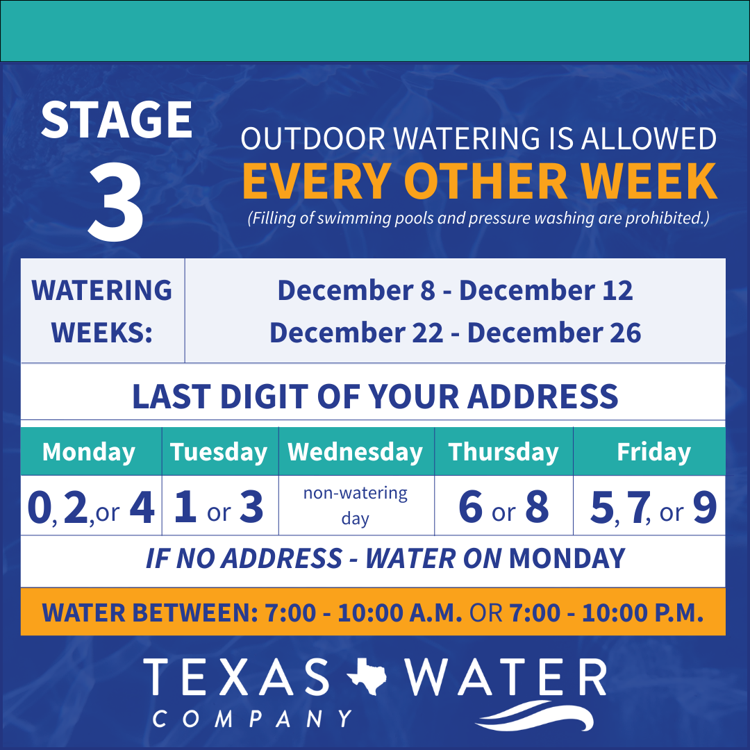 The watering schedule for Stage 3 is the same as the Stage 2 watering schedule. However, additional restrictions to outdoor use may apply (i.e., installation and filling of swimming pools, car washing, and pressure washing). Variance requests for new sod and/or landscaping will not be approved.