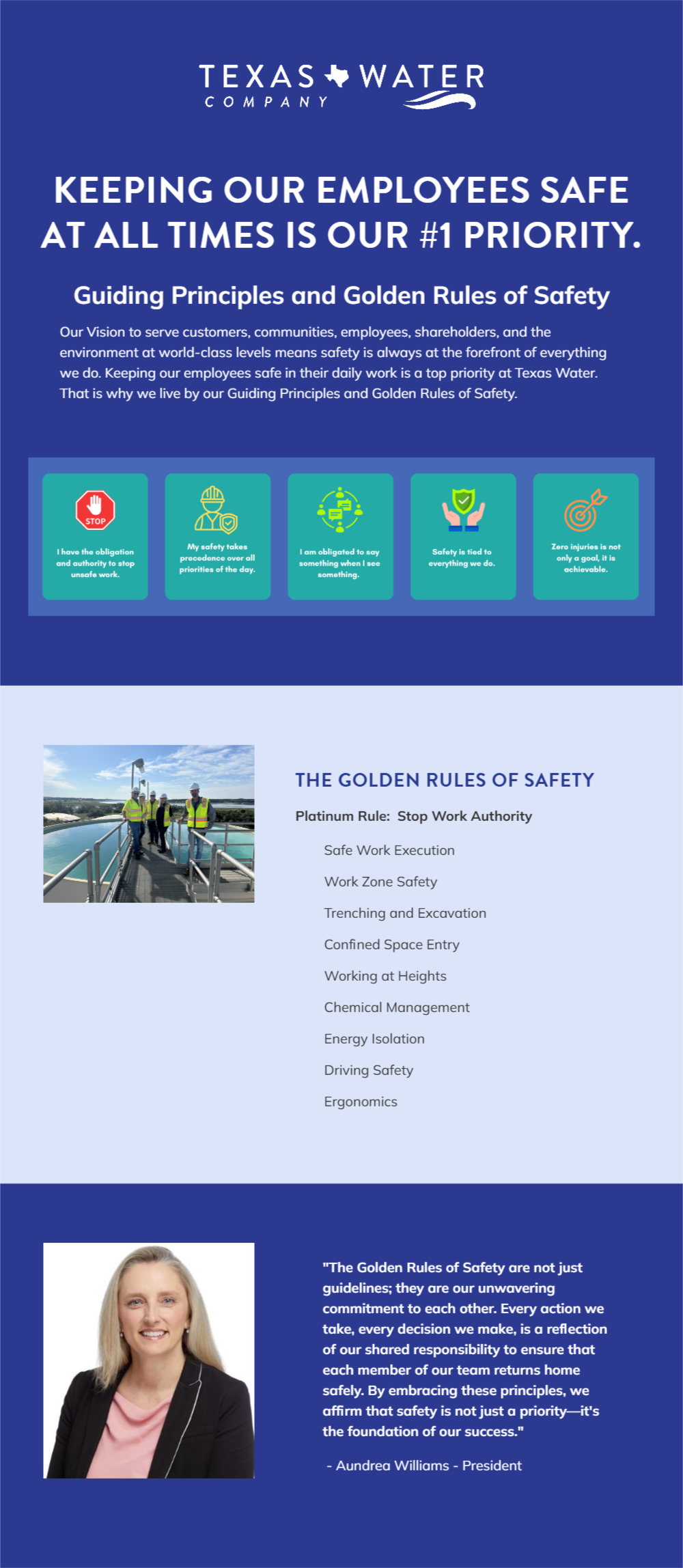 Our Vision to serve customers, communities, employees, shareholders, and the environment at world-class levels means safety is always at the forefront of everything we do. Keeping our employees safe in their daily work is a top priority at Texas Water. That is why we live by our Guiding Principles and Golden Rules of Safety.