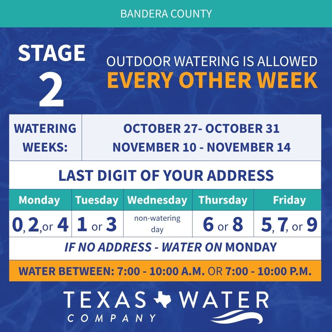 Landscape watering done by automatic, in-ground, or sprinkler systems, hand watering, soaker hose, bucket, and/or drip irrigation is allowed two days per week from 7:00 am to 10:00 am or 7:00 pm to 10:00 pm. The last digit of your address determines your watering days. This schedule is in effect unless or until our Conservation team declares a drought stage, which will have watering restrictions.