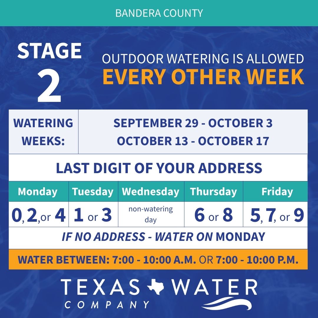 Landscape watering done by automatic, in-ground, or sprinkler systems, hand watering, soaker hose, bucket, and/or drip irrigation is allowed once every other week from 7:00 am to 10:00 am or 7:00 pm to 10:00 pm. The last digit of your address determines your watering days.