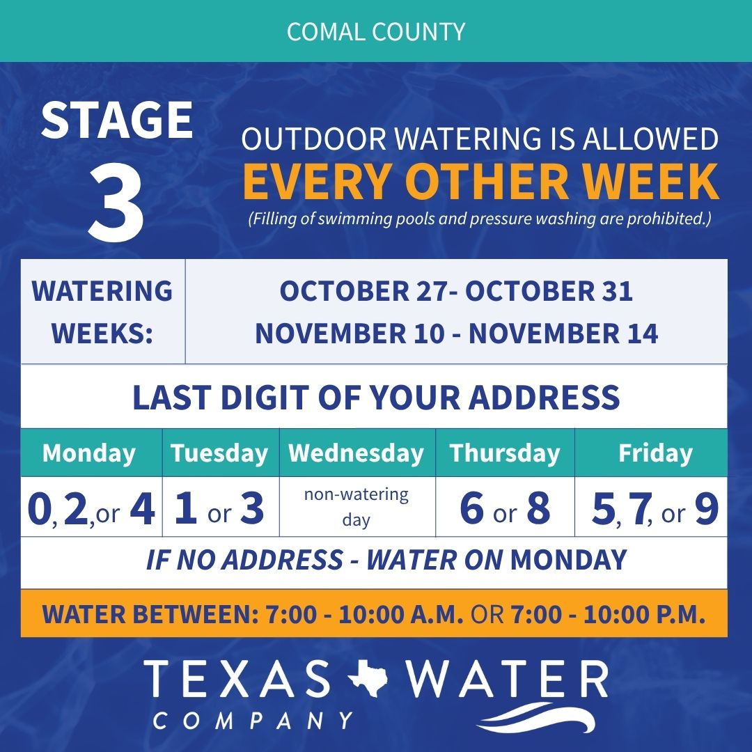The watering schedule for Stage 3 is the same as the Stage 2 watering schedule. However, additional restrictions to outdoor use may apply (i.e., installation and filling of swimming pools, car washing, and pressure washing). Variance requests for new sod and/or landscaping will not be approved.